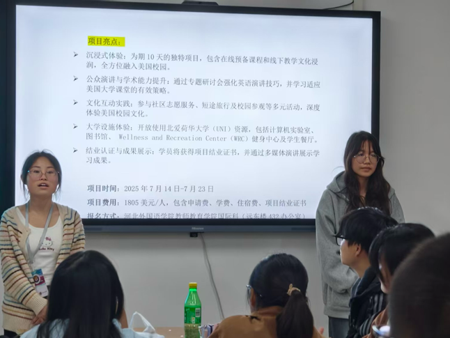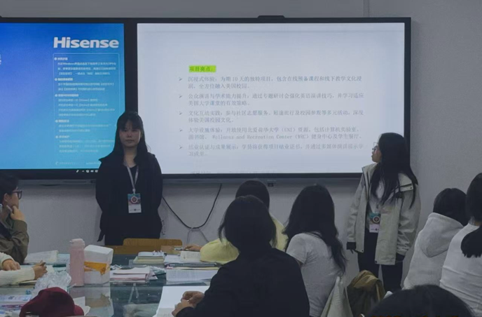 在宣讲环节,外事部干事通过PPT清晰展示了北爱荷华大学的百年校史、雄厚学术实力与优越地理位置。宣讲过程中,外事部干事用生动细致的现场讲解,不仅深入解读了本次项目的特色课程体系,更全面介绍了丰富的文化体验活动,让学生从校情、课程到文化体验多维度理解项目价值,为后续决策提供充分参考。