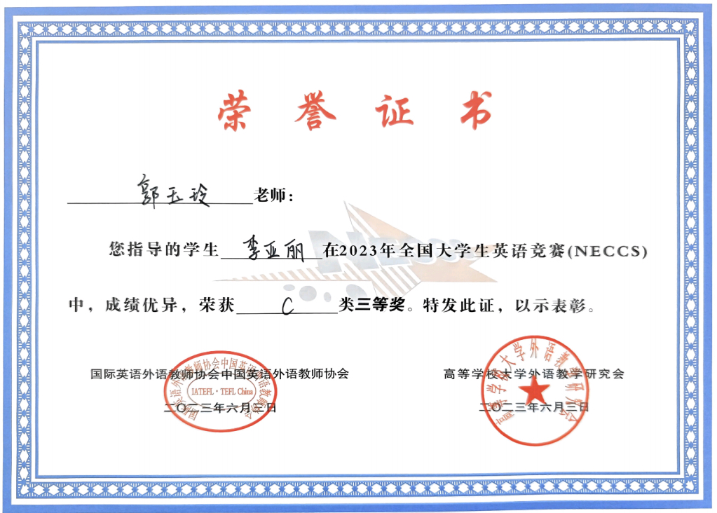 在教学成果方面,2022年郭玉玲老师带领的英语教学法教学团队获得了省级优秀就学团队荣誉称号;郭老师于2015年、2017年和2021年分别参加国家第二届、第三届和第七届河北省外语微课大赛,并获得三等奖和二等奖的荣誉证书;2021年参加河北省第二十五届教育教学信息化交流大赛,并荣获三等奖;2015年参加河北省第六届“外教社杯”全国高校外语教学大赛,荣获省级三等奖;2023年和2024年参加河北省高等学校“世纪之星”外语金课团队大赛,均获得省级三等奖;2025年参加河北省第五届教师教学创新大赛,荣获三等奖;2024年荣获河北外国语学院第二届“海信杯”智慧黑板应用技能大赛二等奖;2025年荣获河北外国语学院2024年度教育教学工作先进个人荣誉称号;2018年被评为“河北外国语学院”教学标兵和科研标兵荣誉称号。