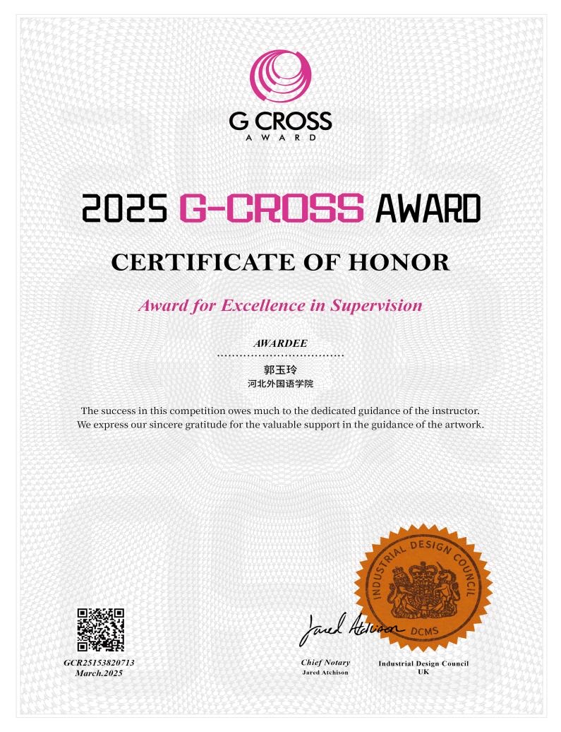 郭老师努力动员并认真指导学生参加各级各类比赛,取得了优异成绩,荣获各类优秀指导教师奖。如,指导学生参加历届河北省“燕赵杯”翻译大赛、全国大学生英语竞赛、第五届GCROSS跨界艺术创意比赛、2025年津晋冀蒙高校师范联盟师范生技能大赛等。