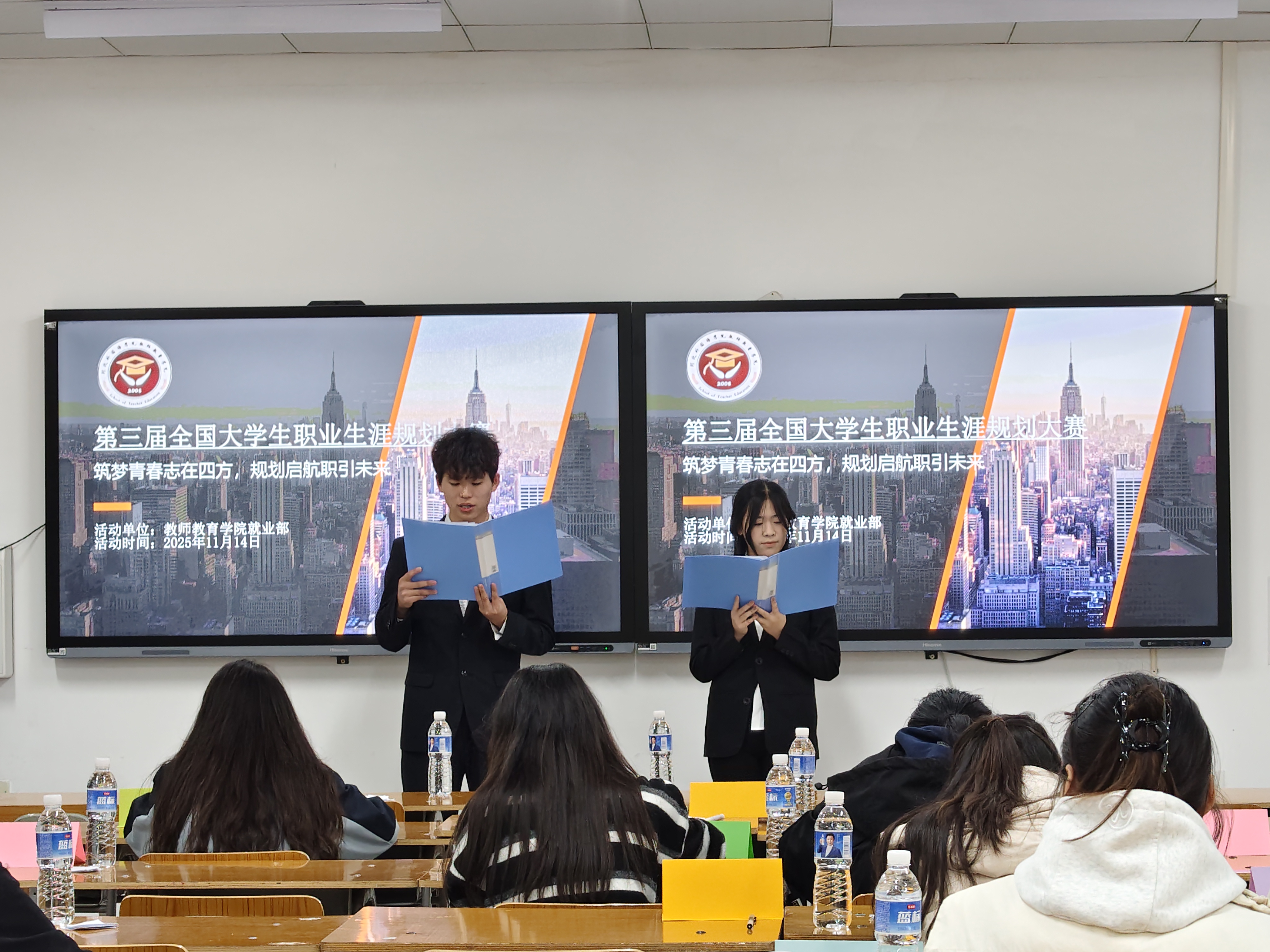 为深入贯彻落实国家就业优先战略,助力学子明确职业发展方向,提升就业竞争力与职业规划能力,教师教育学院就业部于11月13日举办大学生职业生涯规划大赛学院选拔赛。本次大赛以 “筑梦青春志在四方,规划启航职引未来” 为主题,吸引了许多同学参与。