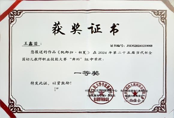 1.2024年第二十五届“当代杯”全国幼儿教师职业技能大赛“舞蹈”组选送作品《阮郎归.初夏》荣获国家一等奖。