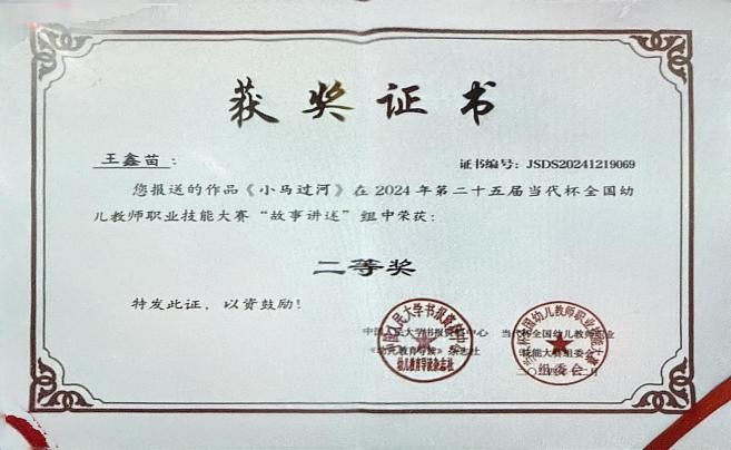 2.2024年第二十五届“当代杯”全国幼儿教师职业技能大赛“故事讲述”组选送作品《小马过河》荣获国家二等奖。
