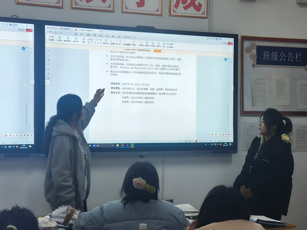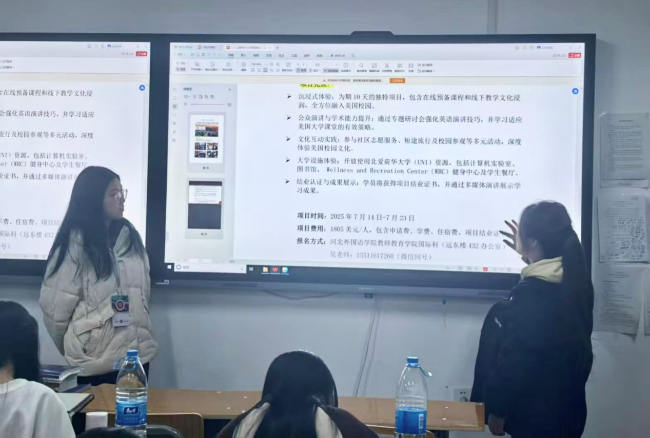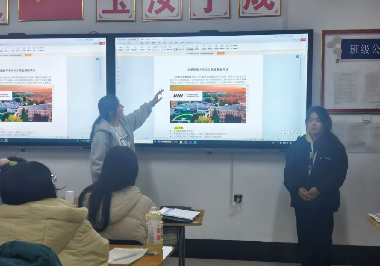 为助力学生拓宽国际视野、提升跨文化核心竞争力,2025年12月8日,教师教育学院外事部干事走进班级,将北爱荷华大学暑期职业探索项目送到学生身边,为意向赴外学习的同学搭建信息桥梁。