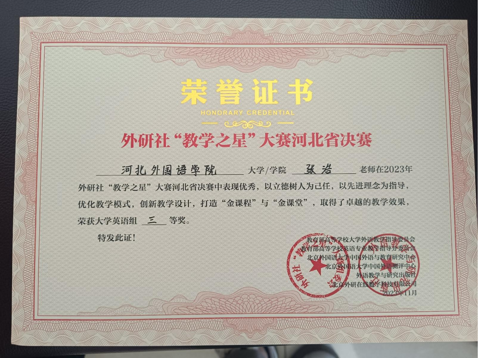 • 作为主讲人参加外教社外语教学大赛大赛并获得三等奖,同时斩获校级外语教学大赛一等奖