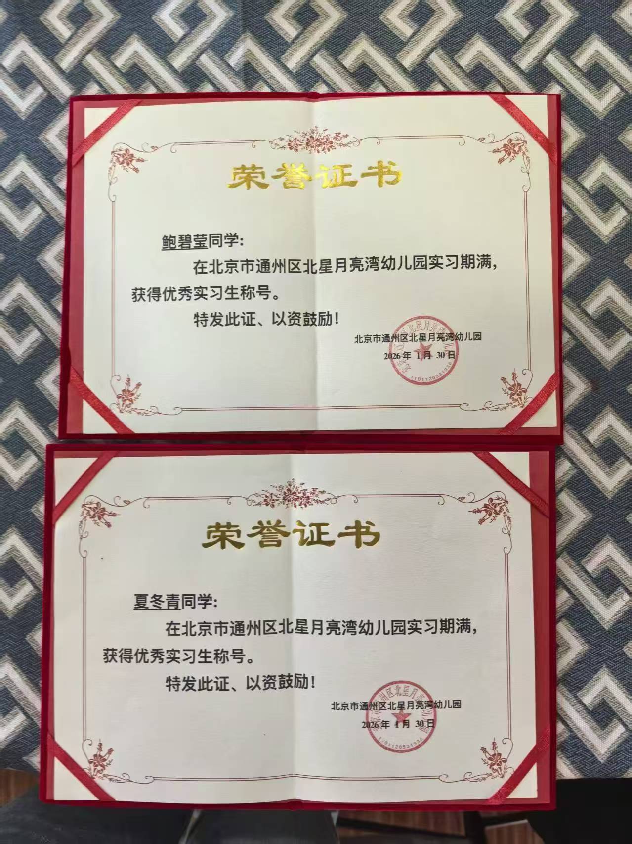 近日,从北京市通州区北星月亮湾幼儿园传来喜报,我院学前教育专业鲍碧莹、夏冬青两位同学,凭借扎实的专业能力、认真负责的工作态度和出色的表现,被授予“优秀实习生”称号。
